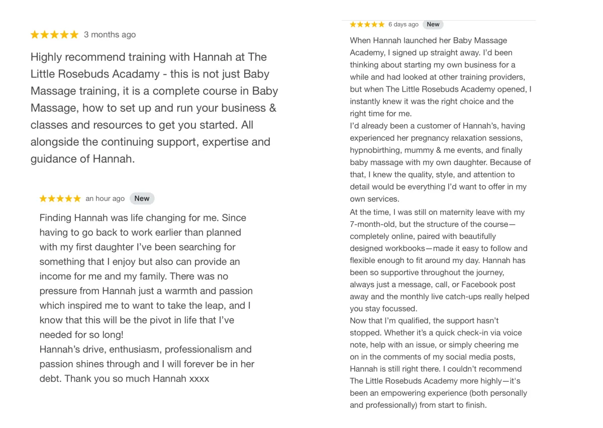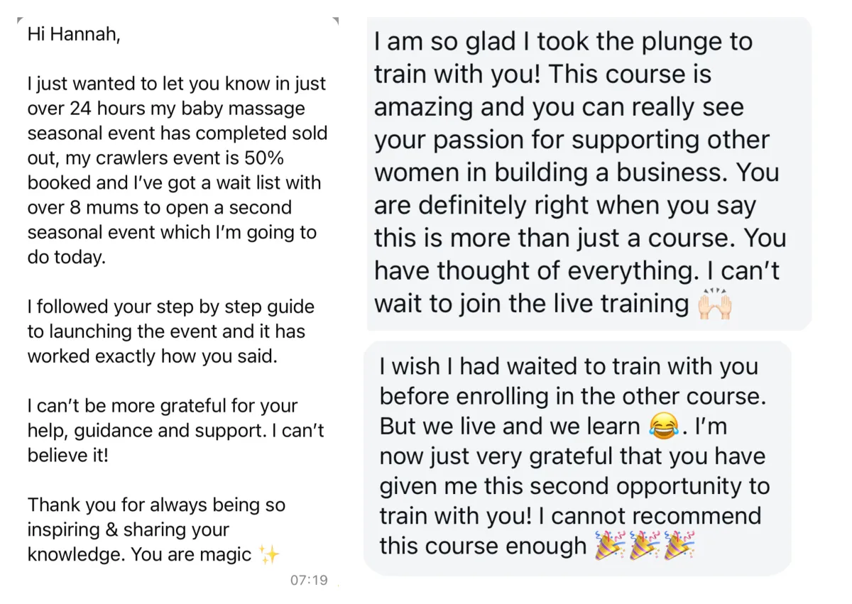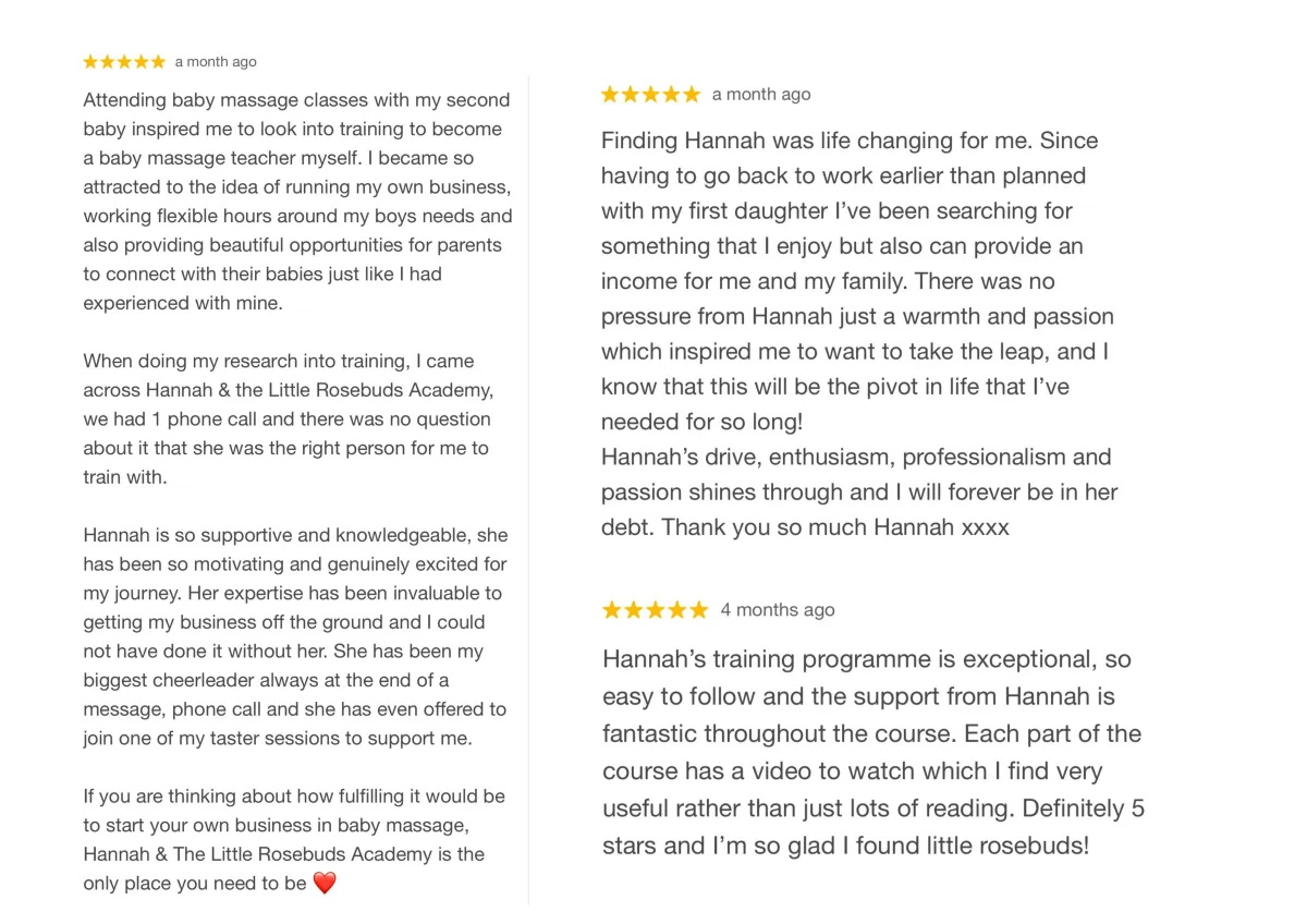 A welcoming and supportive community of other inspirational Baby Massage teachers, monthly online catch up and me as your cheerleader, keeping you inspired and motivated as you take on the world and build the business and life of your dreams.